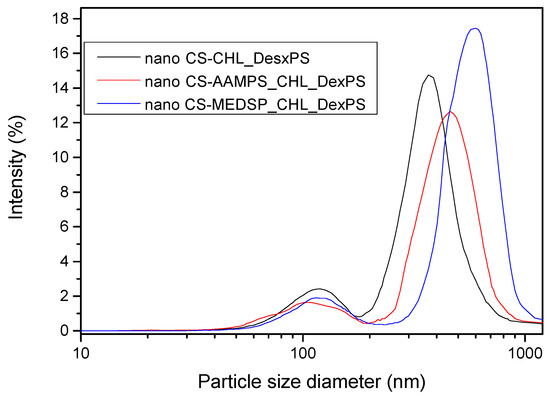 DLS curves of prepared nanoparticles with encapsulated CHL and DexPS drugs.