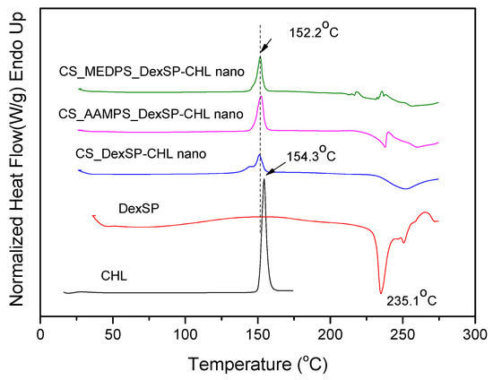 In order to confirm the crystalline or amorphous nature of encapsulated drugs in nanoparticles, DSC thermograms have been also recorded. As can be seen in Figure 8, CHL has a melting point at 154.3 °C, which is very close to that reported from Khan et al. (around 150.48 °C) [105]. However, in DexSP thermograms, there is no melting point recorded, but only an exothermic peak with a maximum at 235.1 °C. This is because DexSP decomposes during melting and such decomposition was also mentioned in literature [106,107]. In drug nanoencapsulated materials, there is a clear melting point at about 152.2 °C, and an exothermic peak started from 220 up to 250 °C, which are attributed to encapsulated CHL and DexSP drugs, respectively. From these thermograms, it was confirmed that both drugs have indeed been encapsulated in nanoparticles, which, in the case of CHL, was also proved from XRD. The exothermic peak in all encapsulated nanoparticles is clear proof that DexSP was encapsulated in nanoparticles and probably in its amorphous form, since on its XRD patterns its crystalline peaks have not been recorded. The differences in recorded positions such as in lower Tm temperature for CHL and in higher decomposition temperatures for DexSP, compared with neat drugs, is an indication that maybe some interactions took place between the polymer matrices and drugs. However, this is not clear, and maybe these differences arise from the fine dispersion of both drugs in polymeric nanoparticles. To evaluate the existence of such interactions, the FT-IR spectra of both neat drugs and their nanoparticles (Figure 9) were obtained by FT-IR spectrophotometer using potassium bromide (KBr) pellets in the area of 4000 to 400 cm−1.