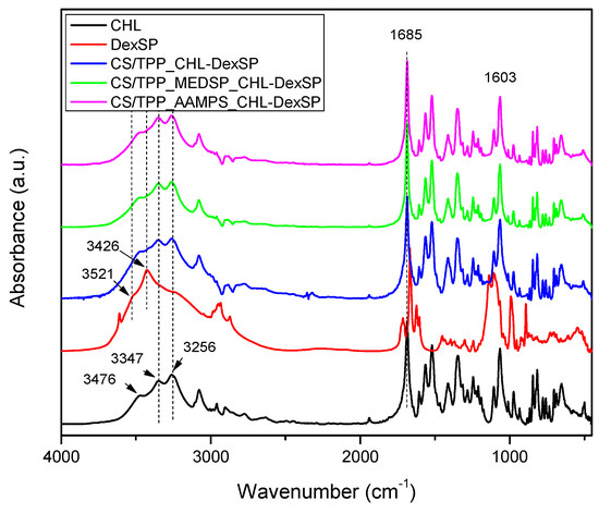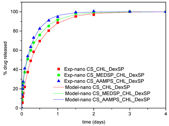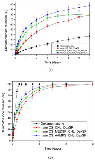 Comparing the spectra of neat drugs and the encapsulated in CS and its derivatives, it can be seen that almost all the characteristic peaks of the drugs remain in the same positions without any shift. Even though both drugs have –OH groups and carbonyl groups and some interactions with the amino and sulfonic groups of CS and their derivatives would be expected, it seems that such interactions are not taking place. This may be because some intermacromolecular interactions between the reactive groups in neat CS and their derivatives are already present. This would be expected mainly in the case of CHL since, from XRD patterns and DSC thermograms, it becomes apparent that the drug was encapsulated in crystalline form. Usually, when interactions are taking place between a polymer and a drug, as in the case of hydrogen bonding between chloramphenicol and poly(vinyl pyrrolidone) (PVP), poly(vinyl alcohol) and Eudragit® [108], amorphous dispersions are produced. In the case of dexamethasone, some interactions with polymers through hydrogen bonding or ionic bonds between PO43− and –N(R)2H+ have been reported [109], as well as through intercalation into layered double hydroxides (LDHs) in which strong electrostatic interactions have been detected [110]. However, such interactions have not been detected in our nanoparticles and the drug amorphization should be due to the high DexSP solubility and probably due to its fine dispersion into the nanoparticles.