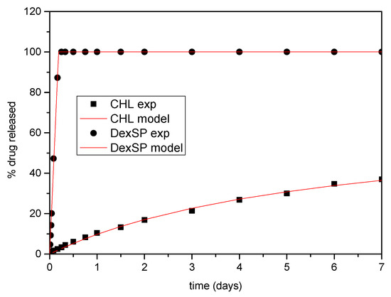 For the in vitro release studies, DISTEK Dissolution Apparatus Evolution 4300 (2100C) (North Brunswick, NJ, USA), equipped with an autosampler using the basket method (USP I method), was used. A sponge was placed to each dissolution vessel corresponding to approximately 400 mg of each formulation in an appropriate transdermal patch holder, with its application side up. The test was performed at 37 ± 1 °C with a rotation speed of 50 rpm. The dissolution medium was 1000 mL of phosphate-buffered saline (PBS)-simulated body fluid, pH = 7.4. Two (2) mL of the aqueous solution was withdrawn from the release media and analyzed for drug content (CHL or DexSP) with the aid of a Shimadzu HPLC system (Kyoto, Japan). The column used was a Canada Newswire (CNW) Technologies Athena C18, 120 A, 5 μm, 250 mm × 4.6 mm at column temperature of 25 °C. The mobile phase consisted of ACN/H2O (acidified with phosphoric acid at final pH = 5) 40/60 v/v, and the flow rate was adjusted to 1.0 mL/min. Concentration determination was performed using an HPLC-UV (Kyoto, Japan) apparatus at 278 nm and was based on a previously created calibration curve and at 254 nm for DexSP. The injection volume was 10 μL. The calibration curve was created by diluting a stock methanol solution of 100 ppm CHL to concentrations 0.5, 1.0, 2.5, 5.0, 10.0, 20 and 25 ppm using the mobile phase. The calibration curve for DexSP was created by diluting a stock methanol solution of 100 ppm to concentrations 0.01, 0.05, 0.1, 0.25, 0.5, 1.0, 2.5, 5.0, 10.0 and 20 ppm using water.