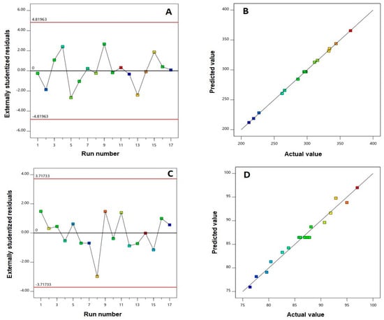 Diagnostic plots for particle size (A,B) and EE% (C,D) of AVA PLGA NPs. Externally studentized residuals vs. run number plots (A,C); and predicted vs. actual value plots (B,D).