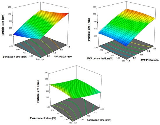 Three-dimensional surface plots for the effect of drug to PLGA ratio (X1), sonication time (X2) and PVA concentration (X3) on the particle size of AVA PLGA NPs.