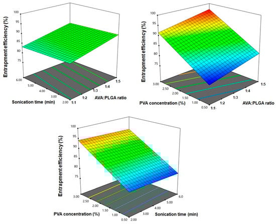 The results of ANOVA statistical analysis revealed that both the AVA:PLGA ratio (X1) and PVA concentration (X3) have a significant effect on EE% (p < 0.0001). Figure 4 illustrated three-dimensional surface plots for the effect of the variables on particle size.
