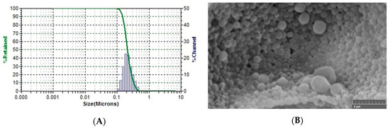 The prepared AVA-NPs revealed particle sizes as measured by particle size analyzer showed a size of 217.4 ± 3.2 nm (Figure 5A). In addition, the SEM image, shown in Figure 5B, revealed that the optimized formulation showed spherical NPs with smooth surfaces, with a relative particle size compared to the data obtained by the particle size analyzer.