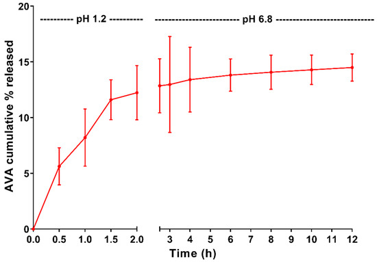 The release profile of optimized AVA-NPs formulation is shown in Figure 6. The results revealed that AVA-NPs formulation showed a two-phase pH dependent release pattern and an initial fast (burst) phase at pH 1.2 (2 h), followed by a slower pseudo steady state rate pattern phase at pH 6.8 (10 h). The optimized AVA-NPs formulation showed AVA% released of 12.237 ± 2.43% within 2 h of release time at pH 1.2, and 14.498 ± 1.22% within 12 h of release time at pH 6.8. The majority (about 85%) of AVA released from the optimized NPs within 12 h was at pH 1.2.