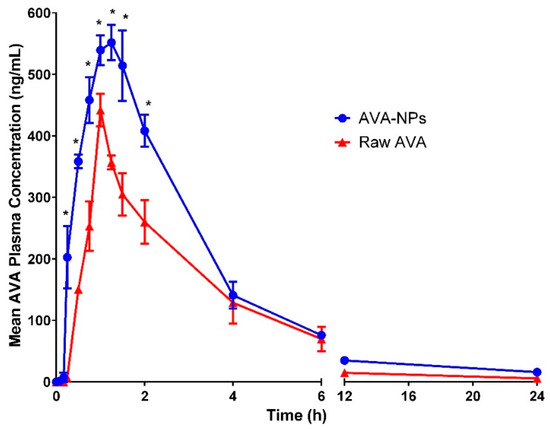Raw AVA and formulated AVA NPs plasma concentration after single oral dose administration to human volunteers (n = 6). * Significant at p < 0.05.