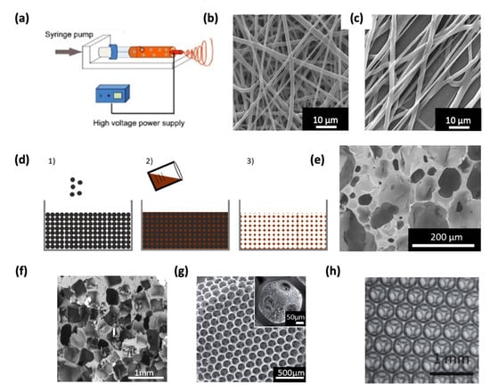 Illustration of the electrospinning process (a). Taken with permission from Li et al. [55] SEM images showing the fiber assembly either randomized (b) or aligned (c), adapted with permission from Ndreu et al. [11]. (d) Illustration of particle leaching process with the template formation (1) followed by matrix pouring (2) and particle dissolution (3) taken from Lutzweiler [56], SEM images of scaffolds generated by chemical foaming (e) taken with permission from Ng et al. [57], particle leaching using salt (f) taken with permission from Janik et al. [58], sphere templating (g) taken with permission from Choi et al. [59], and microfluidics (h) reused with permission from Testouri et al. [48].