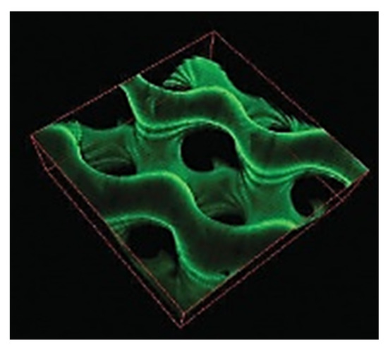 Carboxybetaine methacrylamide (CBMAA)-based porous hydrogel having a gyroid structure. The structure is visualized using a confocal microscope where FITC-BSA is adsorbed on the surface. Adapted with permission from Kostina et al. [79].