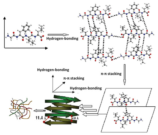 Proposed arrangement of self-assembled peptides (SAP)-based hydrogel from the tetrapeptide (H2N-Gly-Phe-Ile-Leu-COOH) where weak interactions as hydrogen bonding and π-π interactions govern the cross-β structure. Reprinted with permission from Naskar et al. [107]. Copyrights (2020) American Chemical Society.