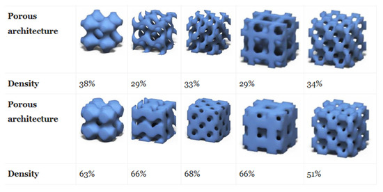 Examples of unit cell design with triply periodic minimal structures (TPMS) with various relative densities () as potential scaffolds for tissue engineering. Adapted with permission from Montazerian et al. [137].