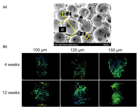 (a) SEM image of a porous scaffold produced by sphere templating where “D” indicates the pore diameter and “d” the interconnection diameter (Image taken by G. Lutzweiler). (b) Evolution of the blood vessels within a porous scaffold as a function of time with varying interconnection diameters (100, 120, and 150 µm). Adapted from Xiao et al. [149] (Creative Commons CC BY).