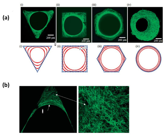 (a) Top images show osteoblasts seeded in four different HA plates with various geometries after 21 days (i–iii) and 30 days (iv) to images taken after 21 days of culture and (iv) at 30 days compared with numerical simulations at the bottom. (b) F-actin filaments (green) are more disordered in areas with high curvature (close to the edge of the triangle) whereas they are more aligned near the tissue/fluid interface (all images adapted from Rumpler et al. [154], Creative Commons Attribution License).