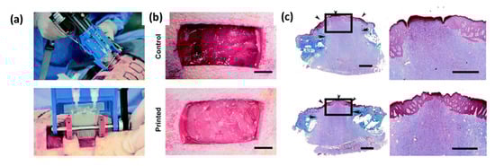 (a) Photograph of the printing of a biopolymer sheet in porcine wound. (b) Difference between the control (without biopolymer sheet) and the wound filled with a biopolymer sheet after 5 min. Scale bar: 2 mm. (c) Re-epithelialization assessed by trichrome staining between control (top images) and wound filled with biopolymer sheet (bottom images), scale bar 2 mm (left), and 1 mm (right). Adapted with permission from Hakimi et al. [218].
