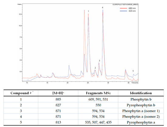 HPLC-MS chromatogram with [M + H]+ mass fragments identification. Chlor for the analysis was dissolved in acetonitrile/methanol/water 70:20:5, v/v.