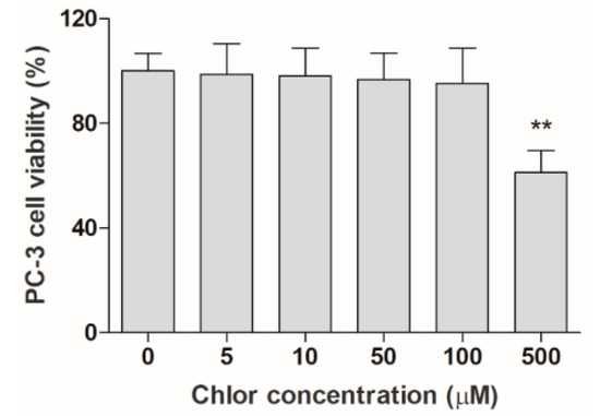 Effect of Chlor on PC-3 cells. Cell viability, after exposure to increasing concentrations of Chlor (5, 10, 50, 100 and 500 μM), was evaluated at 24 h by WST-1 assay. Statistical significance vs. untreated cells: ** p < 0.01.