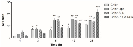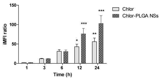 Chlor uptake by DU-145 cells. DU-145 cells were incubated with Chlor and Chlor-PLGA NSs (5 µM) for 1, 3, 6, 12 and 24 h. Fluorescent signal was detected using a flow cytometer at 488 nm excitation to measure the intracellular Chlor and expressed as the iMFI ratio calculated as reported in Materials and Methods. Statistical significance vs. 1 h incubation: * p < 0.05; ** p < 0.01; *** p < 0.001.