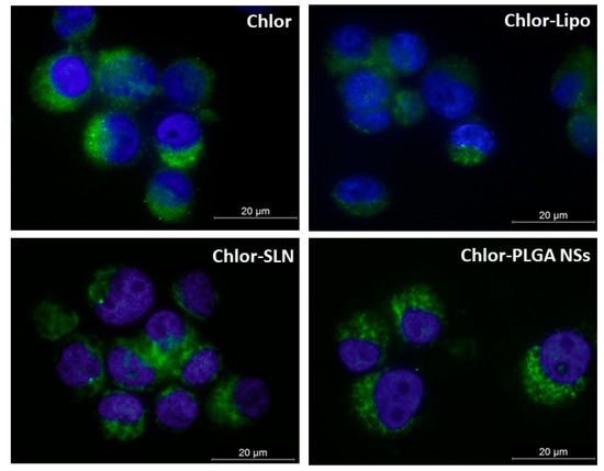 Moreover, to discriminate differences in the Chlor intracellular localization due to the different formulations used, we observed PC-3 cells by fluorescence microscopy. Figure 4 shows principally a cytoplasmic distribution of Chlor for all the formulations tested at the selected times of incubation (6 h for Chlor-Lipo and Chlor-SLN, and 24 h for Chlor and Chlor-PLGA NSs).
