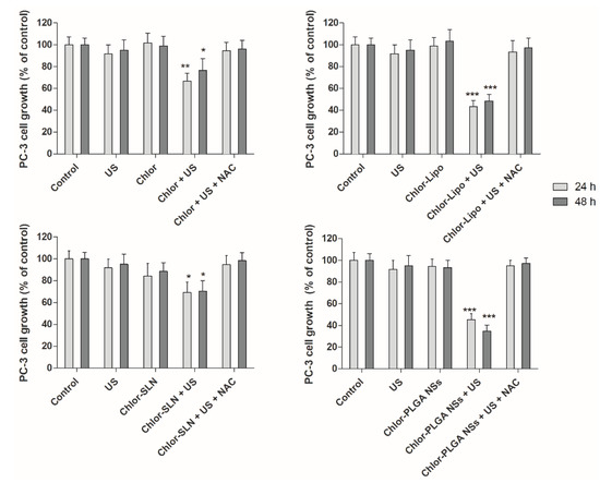 The sonodynamic effect on PC-3 cell growth was evaluated 24 and 48 h after US exposure of the prostatic cancer cells pre-incubated for 6 h with Chlor-Lipo or Chlor-SLN and 24 h with Chlor or Chlor-PLGA NSs at the same Chlor concentration (5 μM). As shown in Figure 5, only when the cells were pre-incubated with one of the Chlor formulations the US were able to significantly decrease PC-3 cell growth. Moreover, the decrease in cell growth was time-independent for all the Chlor formulations. Noteworthy was the fact that the higher decrease in cell growth was obtained by the sonodynamic treatment with Chlor-Lipo and Chlor-PLGA NSs, reaching after 48 h a 48.4 ± 6.2% of cell growth with Chlor-Lipo (p < 0.001) and a 34.8 ± 5.4% of cell growth with Chlor-PLGA NSs (p < 0.001), compared to untreated cell growth.