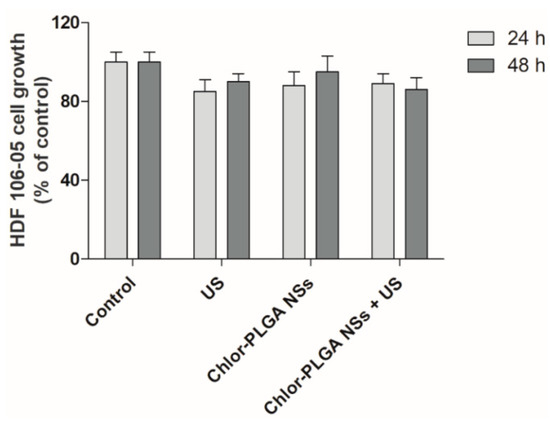 Effect of sonodynamic treatment on HDF 106-05 cell growth. Cells were incubated for 24 h with Chlor-PLGA NSs at the same concentration (5 μM) and then exposed to US at 1.5 MHz for 5 min at 1.5 W/cm2. Cell growth was evaluated after 24 and 48 h by WST-1 assay.
