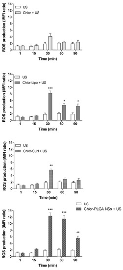 Furthermore, in order to confirm the ROS involvement in the cytotoxicity exerted by the sonodynamic treatment with the different Chlor formulations, we assessed the ROS generation. When PC-3 cells were exposed only to US, a very limited increase in intracellular ROS production was observed, whereas the sonodynamic treatment of PC-3 cells incubated with the different Chlor formulations induced a significant increase in ROS production (Figure 7). The highest level of intracellular ROS generation was achieved 30 min after the exposure of PC-3 cells to US for all the Chlor formulations tested, being the higher ROS levels obtained with Chlor-Lipo (iMFI ratio 8.2 ± 0.7, p < 0.001) and Chlor-PLGA NSs (iMFI ratio 12.3 ± 1.0, p < 0.001). These results mirror the ones showing the higher cytotoxicity by the sonodynamic treatment with Chlor-Lipo and Chlor-PLGA NSs compared to the sonodynamic treatment with Chlor or Chlor-SLN (Figure 5).