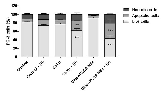 Induction of cell apoptosis on PC-3 cells after sonodynamic treatment with Chlor and Chlor-PLGA NSs. PC-3 cells were exposed to Chlor, Chlor-PLGA NSs (5 µM) for 24 h and then where required underwent to US exposure (1.5 MHz for 5 min at 1.5 W/cm2) or left untreated. Apoptosis assays were carried out by flow cytometry, following APC-Annexin V and PI staining. A percentage of apoptotic cells (positive to APC-Annexin V and negative to PI) and necrotic cells (positive to APC-Annexin V and PI) and live cells (negative to APC-Annexin V and PI) was evaluated 24 h after treatment. Statistical significance vs. untreated cells (i.e., control): ** p < 0.01, and *** p < 0.001.