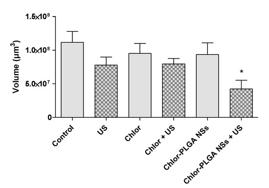 Effect of sonodynamic treatment on DU-145 spheroid volume. DU-145 spheroids were left untreated or treated with Chlor or Chlor-PLGA NSs (10 µM) for 24 h and then, where required, exposed to US (1.5 MHz for 5 min at 1.5 W/cm2). Data are expressed as spheroid volume (µm3). Statistically significant vs. control: * p < 0.05.