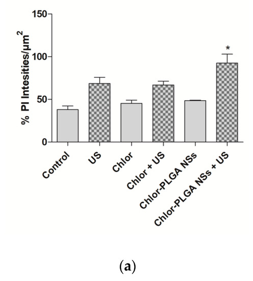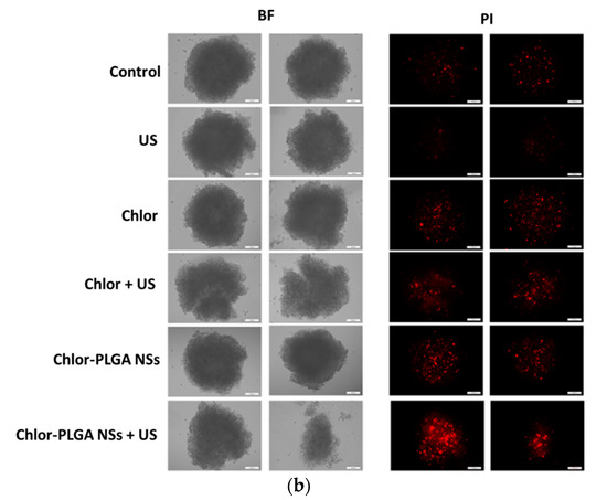 Moreover, PI evaluation identified a slight increase of necrotic cells when DU-145 spheroids were treated with Chlor-PLGA NSs and then exposed to US, observed as well in the quantification of PI signal (Figure 11a,b).