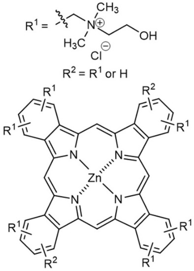 - Makarov, D.A.; Yuzhakova, O.A.; Slivka, L.K.; Kuznetsova, N.A.; Negrimovsky, V.M.; Kaliya, O.L.; Lukyanets, E.A. Cationic Zn and Al phthalocyanines: Synthesis, spectroscopy and photosensitizing properties. J. Porphyr. Phthalocyanines 2007, 11, 586–595. [Google Scholar] [CrossRef]