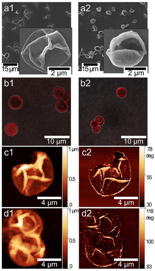 (a1,a2) SEM and (b1,b2) CLSM images of [DS/PArg]4 microcapsules: (a1,b1) intact; (a2,b2) after heat treatment at 80 °C for 60 min. The capsules were post-loaded with RhD6G for visualization with CLSM at λex = 525 nm, λem = 548 nm. (c1,d1) and (c2,d2) AFM images and respective phase contrast of the capsules (c1,c2) before and (d1,d2) after heat treatment.