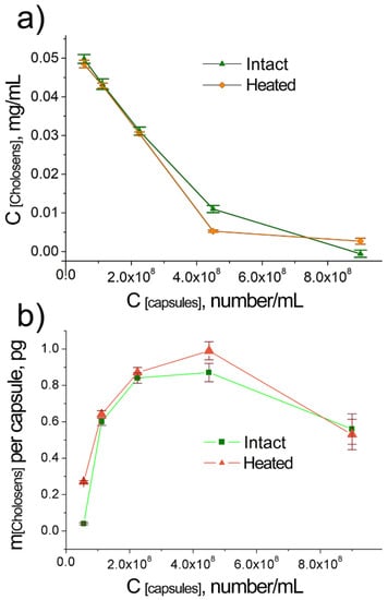 The loading data obtained through measurements of Cholocesns released from enzymatically-degraded capsules (Figure S3a) and through the analysis of its residual amount in the supernatant (Figure 3a) are generally in good agreement and so is the respective data on the loading of a single capsule (Figure 3b and Figure S3b) calculated from the corresponding datasets plotted in Figure 3a and Figure S3a. In essence, capsules in bigger batches do entrap larger amounts of Cholosens. A sharp decrease in the loading of a single capsule, however, was observed at the biggest concentration of 9 × 108 capsules/mL. The observed result contains no contradiction if we take into account the residual concentrations of Cholosens observed for the capsule concentration 4.5 × 108 capsules/mL, which were approximately 20% and 10% of the initial amount in suspension for intact and heated capsules, respectively. As such, at a higher capsule concentration, the drop in the loading per capsule was well-expected because almost the same amount of Cholosens was spread across a larger number of capsules.
