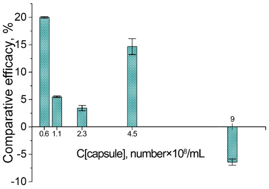 The total amount of loaded Cholosens significantly increased when increasing the capsule concentration for both intact and heated capsules (Figure 3a, Figure S3a). Besides, the amounts of loaded Cholosens in the DS/PArg heated and intact microcapsules were close or slightly higher in the case of heated PMC for the majority of the capsule concentrations (Figure 4). At 9 × 108 capsules/mL, intact PMC displayed better loading than their heated counterparts.