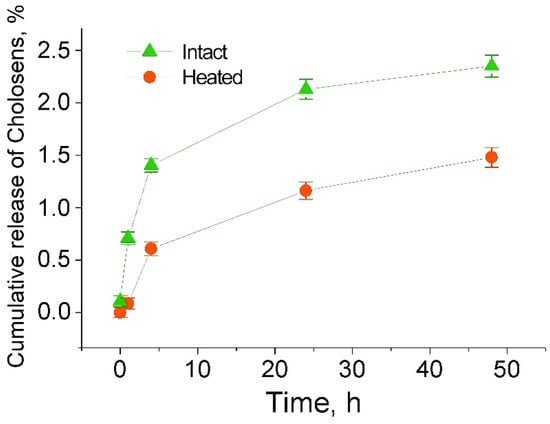 Cumulative release of Cholosens from 4.5 × 108 [DS/PArg]4 microcapsules intact or treated by elevated temperature upon loading (80 °C, 60 min) in 1 mL of 1 × PBS buffer.