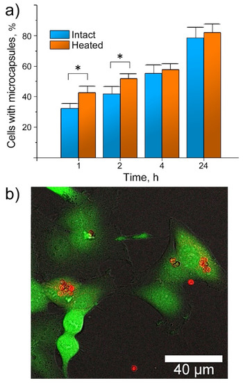 Interactions of [DS/PArg]4 microcapsules with HeLa cells: (a) flow cytometry data on the capsule internalization (10 capsules/cell) showing percentages of cells with at least one capsule (* p < 0.05, intact vs. heated capsules with the same duration of incubation); (b) characteristic CLSM image of HeLa cells incubated with heat-treated [DS/PArg]4 microcapsules loaded with Cholosens (three capsules/cell, 24 h, 37 °C). Green color displays the calcein-AM dye metabolized by viable cells (λex = 495 nm, λem = 515 nm), and red color displays Cholosens encapsulated in [DS/PArg]4 microcapsules (λex = 685 nm, λem = 715–780 nm).