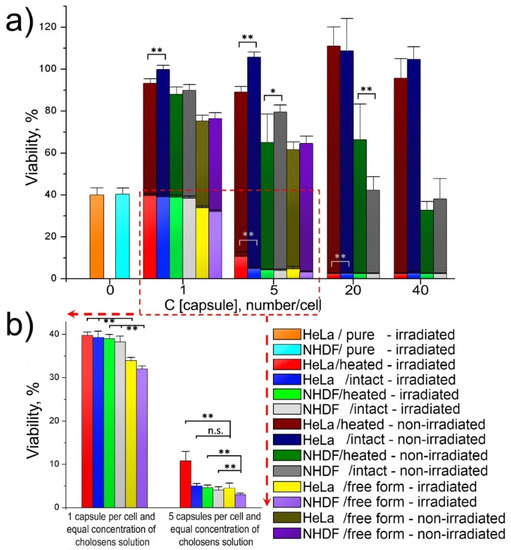 Corresponding data on the viability of non-irradiated HeLa and NHDF cells grown without any of encapsulated or free forms of Cholosens were taken as 100%.