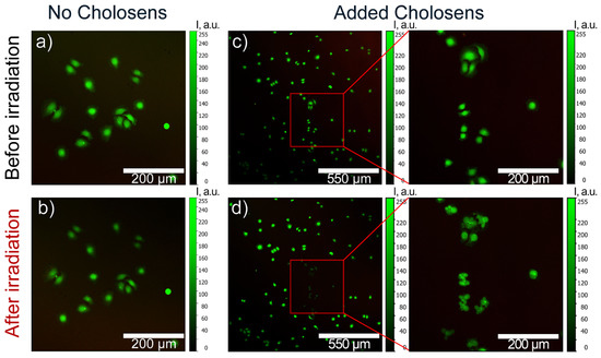 CLSM images of calcein-AM-stained HeLa cells showing the photodynamic effect of a free form of Cholosens added an amount equal to that of the encapsulated drug at the concentration of three capsules per cell: (a,b) cells with no added Cholosens before and after light irradiation at 670 nm for 60 s, respectively; (c,d) cells in the Cholosens solution before and after light irradiation at 670 nm for 60 s, respectively. Red squares in the images (c,d) outline the irradiated area in the sample containing Cholosens. Zoom-in images of the outlined area before and after light exposure are shown to the right of the individual images (c,d). Color scale from 0 to 255 a.u. depicts the fluorescence intensity for a direct comparison of the images.