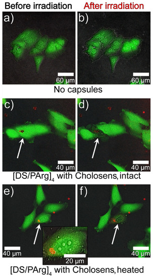 CLSM images of calcein-AM-stained HeLa cells (green fluorescence) showing the photodynamic effect of the encapsulated forms of Cholosens (red fluorescence): (a,b) control cells incubated without PMC; (c–f) cells incubated with [DS/PArg]4 microcapsules ((c,d) intact, (e,f) heated) added at the concentration of three capsules/cell (37 °C, 24 h) before and after light irradiation at 670 nm for 60 s, respectively. White arrows point to the individual cells, which were exposed to light irradiation. The capsules were added in the amount of three capsules/cell.