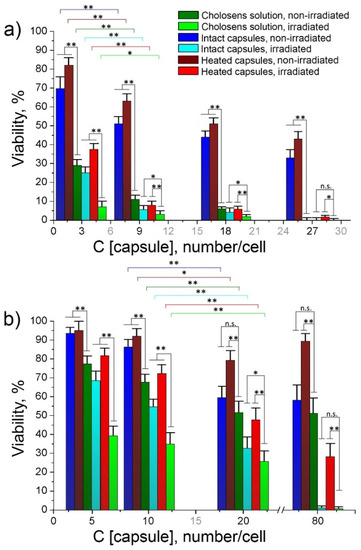 Light and dark viability of bacterial cells depending on the number of Cholosens-loaded capsules (intact or heated) added to the culture medium: (a) Gram-positive S. aureus; (b) Gram-negative E. coli. Corresponding data on the viability of non-irradiated S. aureus and E. coli grown without any of encapsulated or free forms of Cholosens were taken as 100%. The figure legend is uniform across the graphs a and b. The statistical significance of the differences between the observed results was determined against the corresponding Cholosens solution with or without laser irradiation and between the samples containing different numbers of capsules: three and nine capsules/cell (a) and 10 and 20 capsules/cell (b) (n = 6, * p < 0.05, ** p < 0.01). The respective Student’s t-test results are shown in Tables S7–S9. The respective IC50 values for each drug form are shown in Table S11.