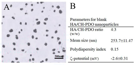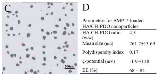 Blank HA/CH-PDO NPs were first prepared to optimize their composition and major parameters. Figure 1A,B show a representative TEM image and major parameters for blank HA/CH-PDO NPs. These NPs were seen to be approximately spherical with various sizes changing from several tens of nanometers to around 300 nm, and they had small negative ζ-potential of around −2 mV. Incorporation of BMP-7 into HA/CH-PDO NPs did not impose significant effects on the morphology, mean size and ζ-potential of the resulting NPs (Figure 1C,D). It is worth pointing out that the composition for BMP-7-loaded HA/CH-PDO NPs was formulated as a HA/CH-PDO ratio of 4:3 in this study in order to achieve high EE while enabling the surface charge of the resulting NPs to be nearly neutral (Figure 1D).