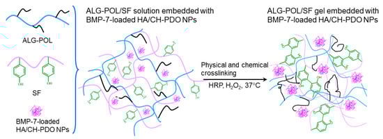 ALG-POL is a type of thermoresponsive copolymer and their solutions can transform into gels under temperature stimulation, which results in formation of physically crosslinked network inside the resulting gels [,]. The tyrosine residues in SF molecules can be chemically crosslinked via the mediation of co-agents, namely, HRP and H2O2 [,]. Therefore, it is feasible to build a new type of ALG-POL/SF hydrogel with physically and chemically crosslinked networks on account of their independent gelable mechanisms. Figure 2 shows a schematic representation for the construction of ALG-POL/SF composite gel. The resulting gel is intended for use in delivering both BMP-7 and cells.