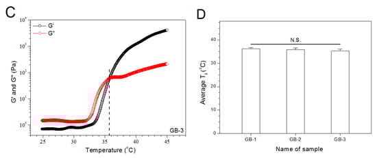 Temperature dependencies (A–C) of G′ and G′′ and incipient gelling temperature (D) for composite gels without bone morphogenetic protein (BMP)-7 load.