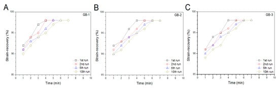 Strain–recovery of gel samples with compression deformation of 50% related to their original height during four discontinuous loading-unloading cycles.