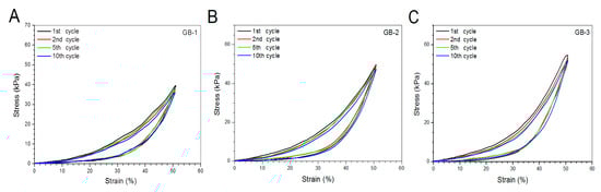 Stress–strain hysteresis plots of gel samples during the 1st, 2nd, 5th and 10th cycles of loading and unloading to a strain magnitude of 50%.