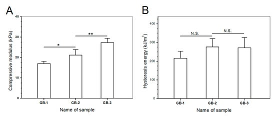 Compression modulus (A) and dissipation energy changes (B) for different gel samples (*, p < 0.05; **, p < 0.01; N.S., no significance).