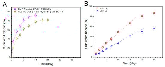 BMP-7 release profiles. (A) BMP-7-loaded HA/CH-PDO NPs and ALG-POL/SF gel directly loading with BMP-7; and (B) Gels embedded with BMP-7-loaded HA/CH-PDO NPs (see Table 2).