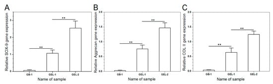 Chondrogenic gene expression of SOX-9 (A), aggrecan (B) and COL II (C) (**, p < 0.01).