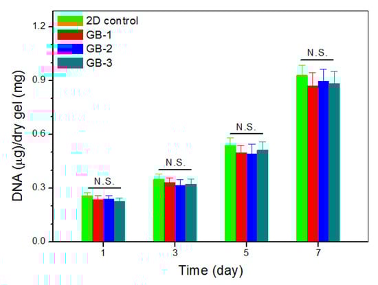 An important issue for the presently developed dual network gels is whether they are able to generate a suitable three-dimensional environment for supporting the growth of SMSCs. Blank ALG-POL/SF (see Table 1 for their composition) were thus seeded with SMSCs and cultured in vitro to determine cell proliferation, and relevant data are graphed in Figure 9. The bar-graph indicates that growth of cells was seen to roughly experience two phases: fewer cells grew from day 1 to day 3; and cells grew fast from day 5 to day 7. The slow cell growth in the first phase can be ascribed to the attachment of cells with population recovery; and the second phase confirms the occurrence of cell proliferation due to the growing DNA amount. Besides these, Figure 9 also shows that there were no significant differences in detected DNA amount among these gels, suggesting that they have similar abilities to support the proliferation of SMSCs even though they have some differences in their composition.