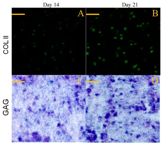 Immunofluorescence staining (A,B) for COL II and toluidine blue staining (C,D) for GAG (scale bar: 100 μm).