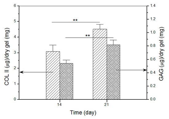 Detected amounts of COL II and GAG in cell-seeded gels (**, p < 0.01).