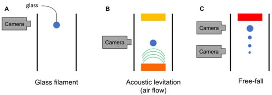 To exclude the interference of either a filament or an acoustic field on the drying kinetics, the free-fall method can be used. As its name already indicates, the droplet is not supported during the drying process, but freely falls through a drying chamber as a consequence of gravitational force. This implies that the drying kinetics monitored using this droplet drying technique are closest to pharmaceutical applications such as spray drying and electrospraying. A schematic illustration of the free-fall method is depicted in Figure 2c [15]. With this method it is not only possible to investigate one droplet at a time, since a chain of droplets with identical size and properties is also widely applied [1].