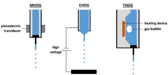 Schematic illustration of a mechano-hydrodynamic droplet generator (MHDG) equipped with a piezoelectric transducer, an electro-hydrodynamic droplet generator (EHDG) in (micro)dripping mode and a thermo-hydrodynamic droplet generator (THDG) (modified from Liu et al. [31]).